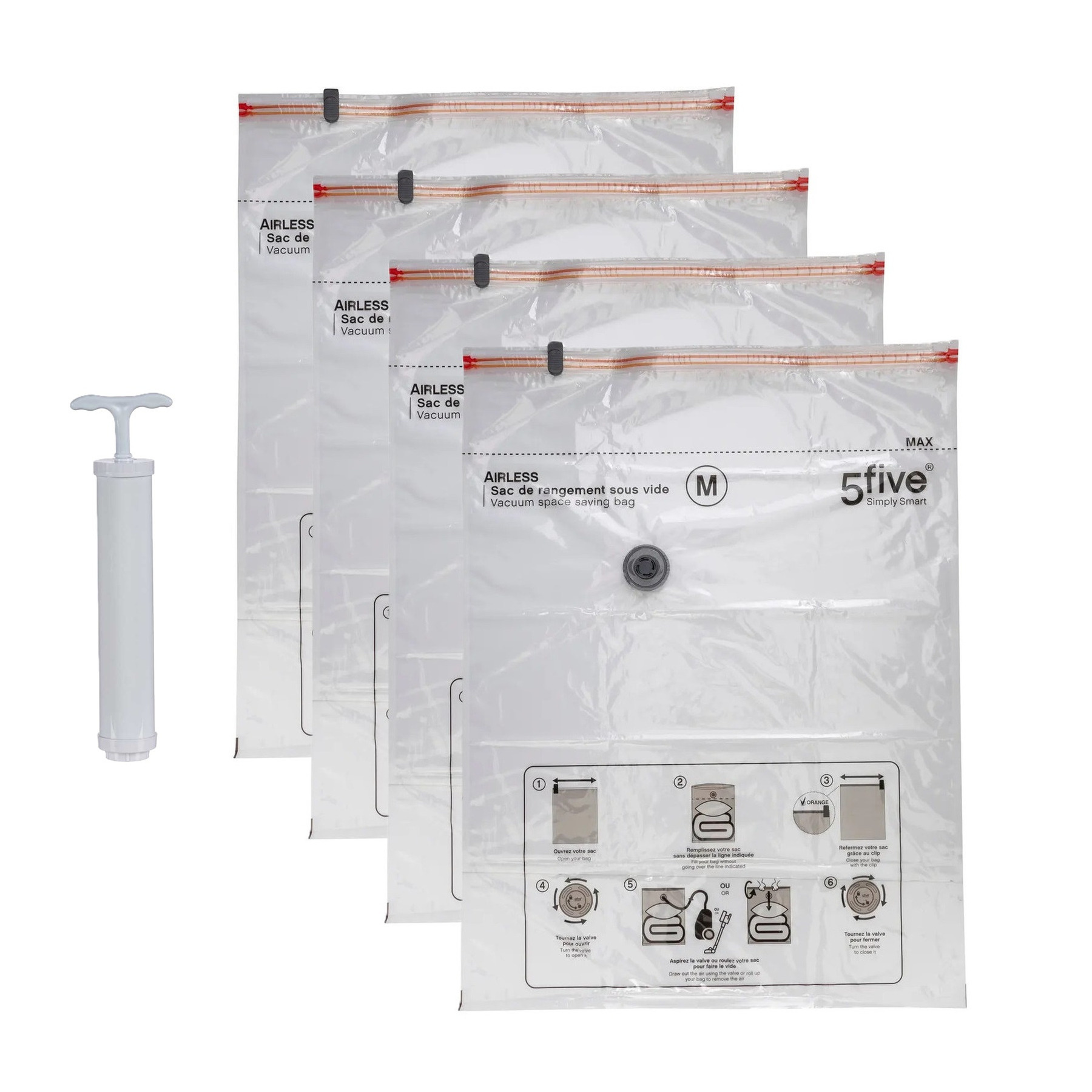 Vacuum opbergzakken van het merk 5Five voor kleding, kussens en dekens, set van 4x stuks, inclusief een pomp. Optimaliseer je opbergruimte met deze vacuumzakken van 60 x 80 cm. Opruimen wordt eenvoudig en efficient, of het nu gaat om je kast, zolder, of koffer. Creeer in een handomdraai tot 60% meer opbergruimte door de lucht te verwijderen met een stofzuiger of een vacuumpomp. Ideaal voor reizigers die hun koffer slim willen inpakken. Optimaliseer je opbergruimte en maak opruimen een stuk eenvoudiger met deze handige vacuum opbergzakken. Waterbestendig en stofvrij inpakken. Dit noemen we ook wel compressie zakken.