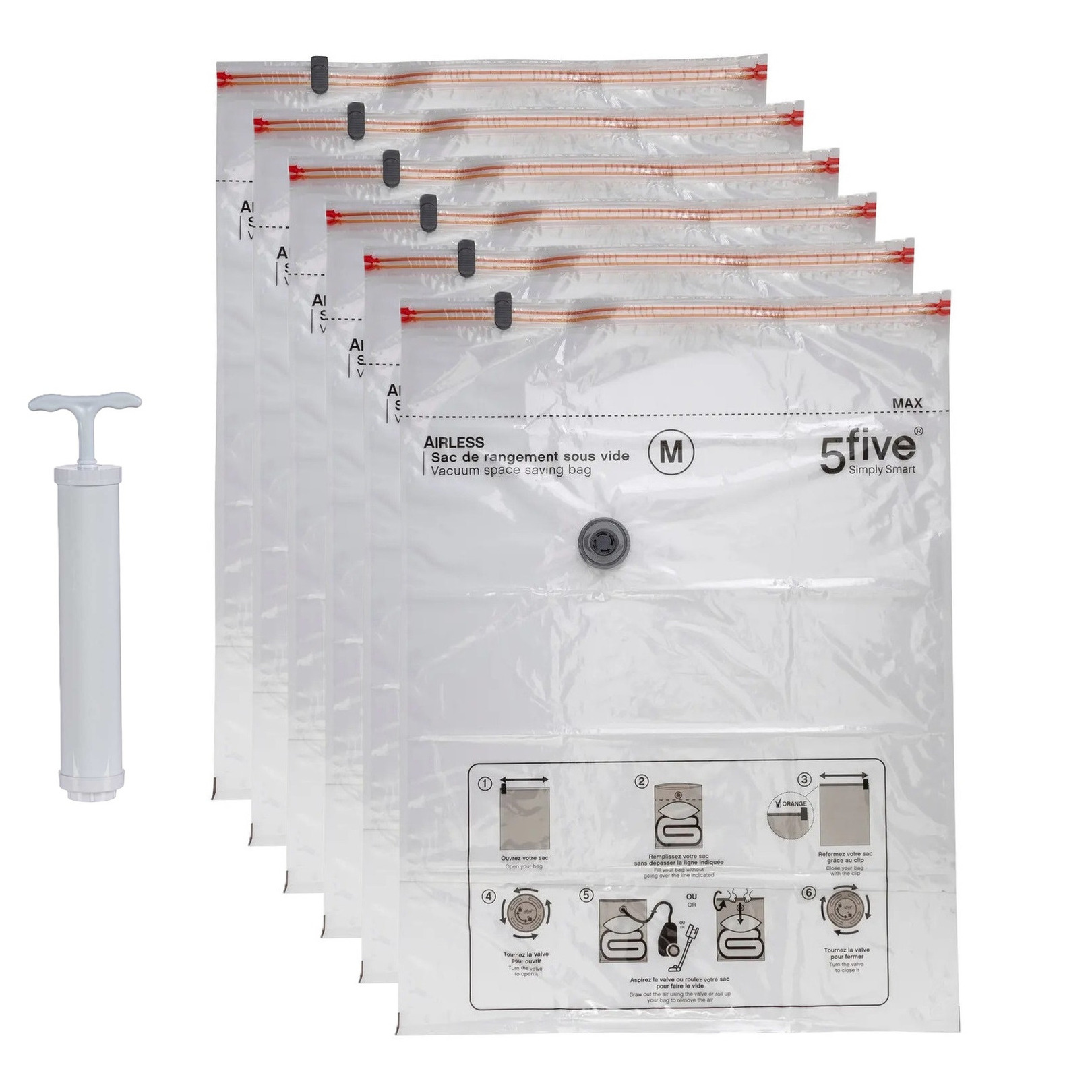 Vacuum opbergzakken van het merk 5Five voor kleding, kussens en dekens, set van 6x stuks, inclusief een pomp. Optimaliseer je opbergruimte met deze vacuumzakken van 60 x 80 cm. Opruimen wordt eenvoudig en efficient, of het nu gaat om je kast, zolder, of koffer. Creeer in een handomdraai tot 60% meer opbergruimte door de lucht te verwijderen met een stofzuiger of een vacuumpomp. Ideaal voor reizigers die hun koffer slim willen inpakken. Optimaliseer je opbergruimte en maak opruimen een stuk eenvoudiger met deze handige vacuum opbergzakken. Waterbestendig en stofvrij inpakken. Dit noemen we ook wel compressie zakken.