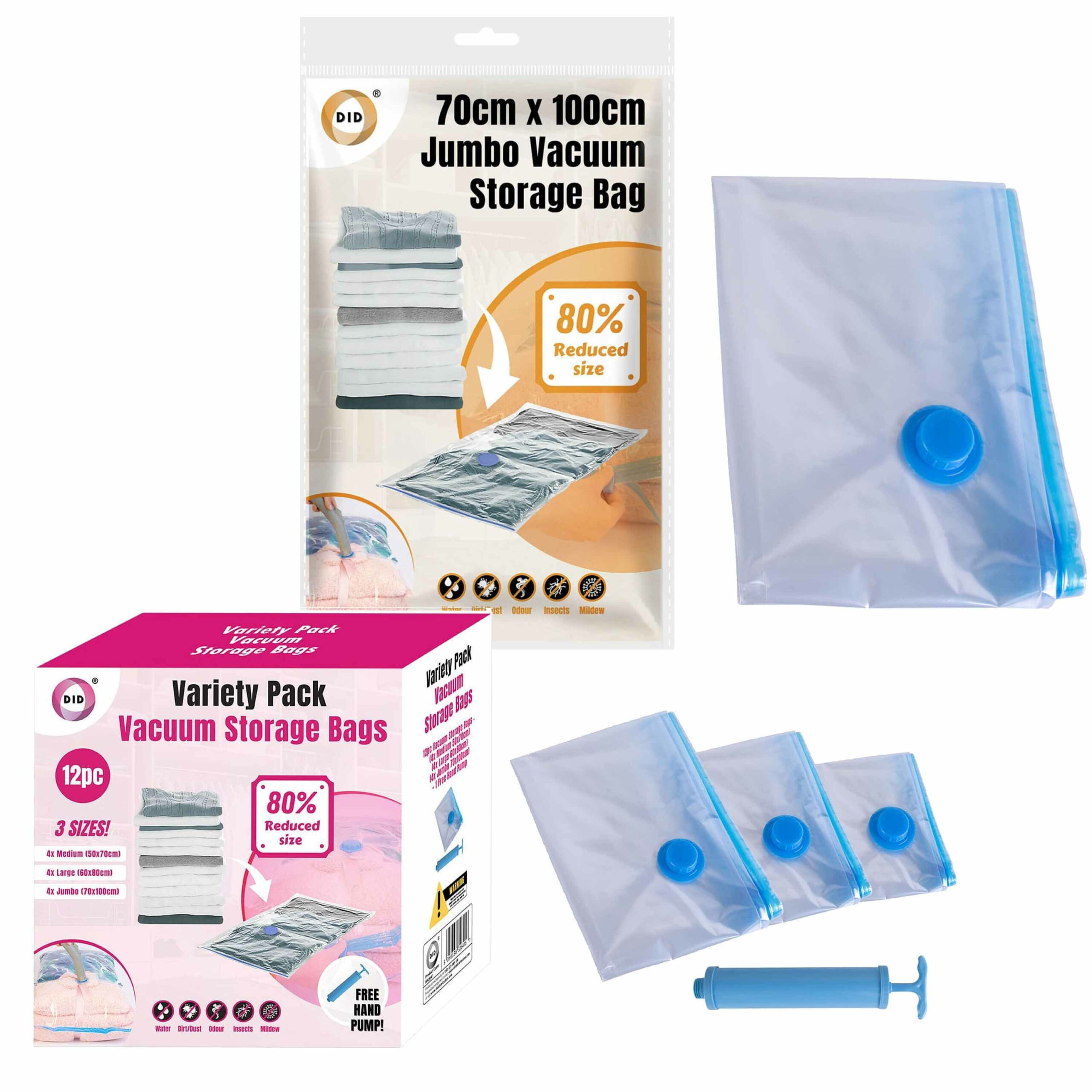 Set van 15 stuks compressie/vacuum opbergzakken in 3 formaten. Ruim kleding en of beddengoed eenvoudig op met deze transparante compressie/vacuum opbergzakken die tot 80% ruimte besparen. De zakken beschermen tegen vocht, vuil, geur, insecten en schimmels. Handpomp is meegeleverd. Materiaal: kunststof. Afmeting opbergzakken: 4 stuks van 50 x 70 cm, 4 stuks van 60 x 80 cm en 7 stuks van 70 x 100 cm. , Dit artikel bestaat uit:, 1x Compressie/vacuum opbergzakken met handpomp – 12 stuks – 3 formaten, 3x Compressie/vacuum opbergzak – 70 x 100 cm